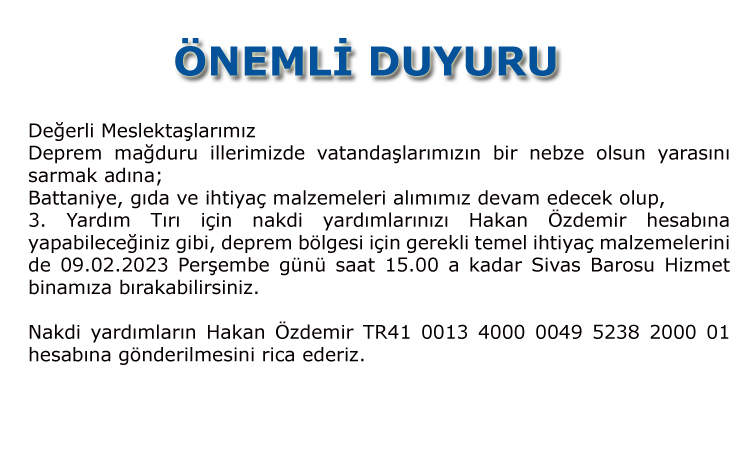 ANA SAYFA DUYURU Değerli Meslektaşlarımız Deprem mağduru illerimizde vatandaşlarımızın bir nebze olsun yarasını sarmak adına; Battaniye, gıda ve ihtiyaç malzemeleri alımımız devam edecek olup, 3. Yardım Tırı için nakdi yardımlarınızı Hakan Özdemir hesabına yapabileceğiniz gibi, deprem bölgesi için gerekli temel ihtiyaç malzemelerini de 09.02.2023 Perşembe günü saat 15.00 a kadar Sivas Barosu Hizmet binamıza bırakabilirsiniz. Nakdi yardımların Hakan Özdemir TR41 0013 4000 0049 5238 2000 01 hesabına gönderilmesini rica ederiz. PAYLAŞ Duyurular Balkan Turu Duyurusu. Önemli Duyuru. 2025 Yılı Dergimiz Siz Okurlarıyla Buluştu KURBAN BAYRAMINIZ KUTLU OLSUN - 06.06.2025 MAKALE "4. YARGI PAKETİ" KINAMA - 25.08.2021 FAALİYET RAPORU 2021 NİSAN - AĞUSTOS YENİ ADLİ YILIMIZ KUTLU OLSUN HAYVAN HAKLARI İHLALİ HAKKINDA - 23.09.2021 TBB DUYURUSU - 28.09.2021