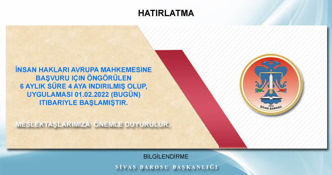 ANA SAYFA HATIRLATMA HATIRLATMA: İnsan Hakları Avrupa Mahkemesine başvuru için öngörülen 6 aylık süre 4 aya indirilmiş olup, uygulaması 01.02.2022 (bugün) itibariyle başlamıştır. Meslektaşlarımıza önemle duyurulur. SİVAS BAROSU BAŞKANLIĞI PAYLAŞ Duyurular Balkan Turu Duyurusu. Önemli Duyuru. 2025 Yılı Dergimiz Siz Okurlarıyla Buluştu KURBAN BAYRAMINIZ KUTLU OLSUN - 06.06.2025 MAKALE "4. YARGI PAKETİ" KINAMA - 25.08.2021 FAALİYET RAPORU 2021 NİSAN - AĞUSTOS YENİ ADLİ YILIMIZ KUTLU OLSUN HAYVAN HAKLARI İHLALİ HAKKINDA - 23.09.2021 TBB DUYURUSU - 28.09.2021