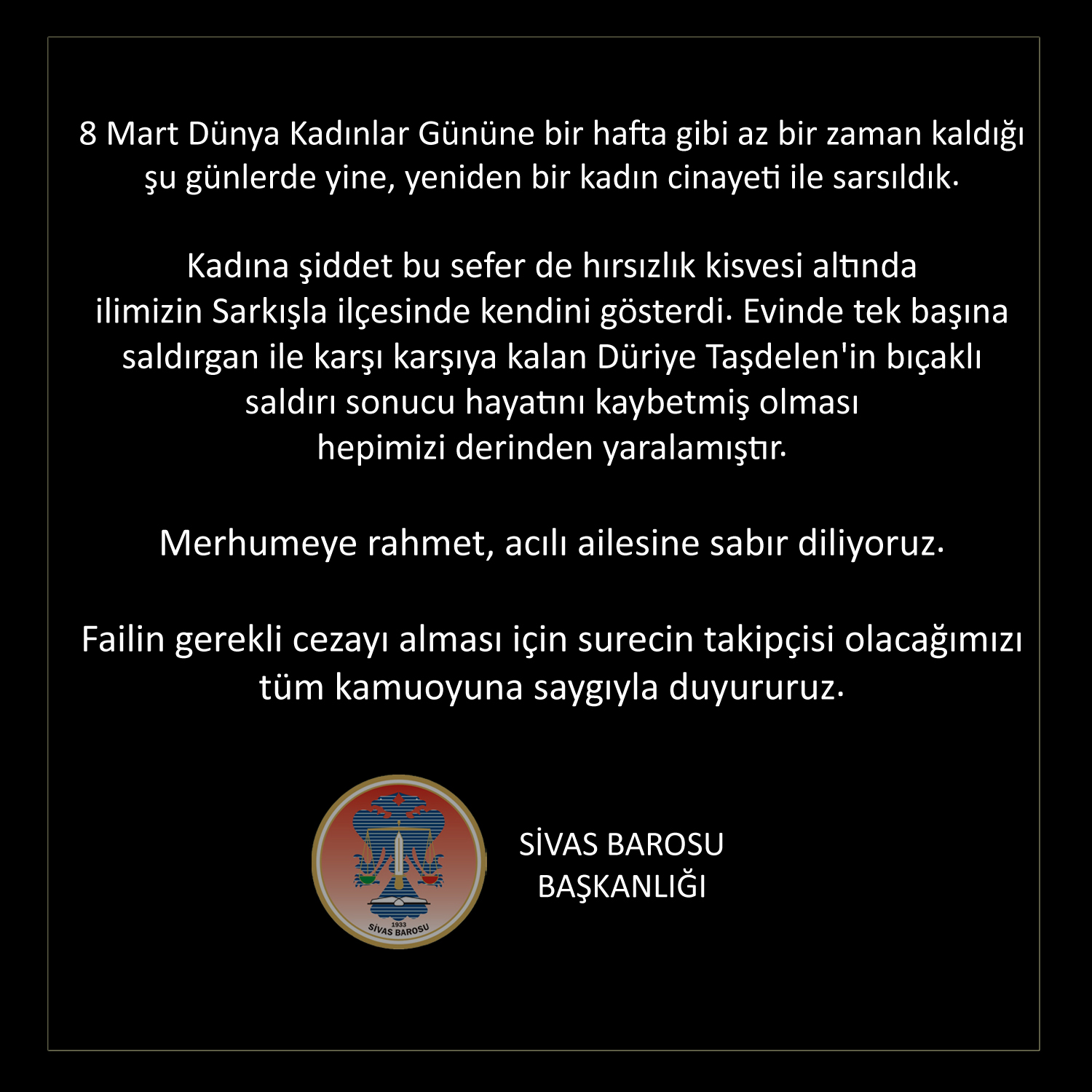 ANA SAYFA KAMUOYUNA-1 8 Mart Dünya Kadınlar Gününe bir hafta gibi az bir zaman kaldığı şu günlerde yine, yeniden bir kadın cinayeti ile sarsıldık. Kadına şiddet bu sefer de hırsızlık kisvesi altında ilimizin Sarkışla ilçesinde kendini gösterdi. Evinde tek başına saldırgan ile karşı karşıya kalan Düriye Taşdelen'in bıçaklı saldırı sonucu hayatını kaybetmiş olması hepimizi derinden yaralamıştır. Merhumeye rahmet, acılı ailesine sabır diliyoruz. Failin gerekli cezayı alması için surecin takipçisi olacağımızı tüm kamuoyuna saygıyla duyururuz. Sivas Barosu Başkanlığı PAYLAŞ Duyurular Balkan Turu Duyurusu. Önemli Duyuru. 2025 Yılı Dergimiz Siz Okurlarıyla Buluştu KURBAN BAYRAMINIZ KUTLU OLSUN - 06.06.2025 MAKALE "4. YARGI PAKETİ" KINAMA - 25.08.2021 FAALİYET RAPORU 2021 NİSAN - AĞUSTOS YENİ ADLİ YILIMIZ KUTLU OLSUN HAYVAN HAKLARI İHLALİ HAKKINDA - 23.09.2021 TBB DUYURUSU - 28.09.2021